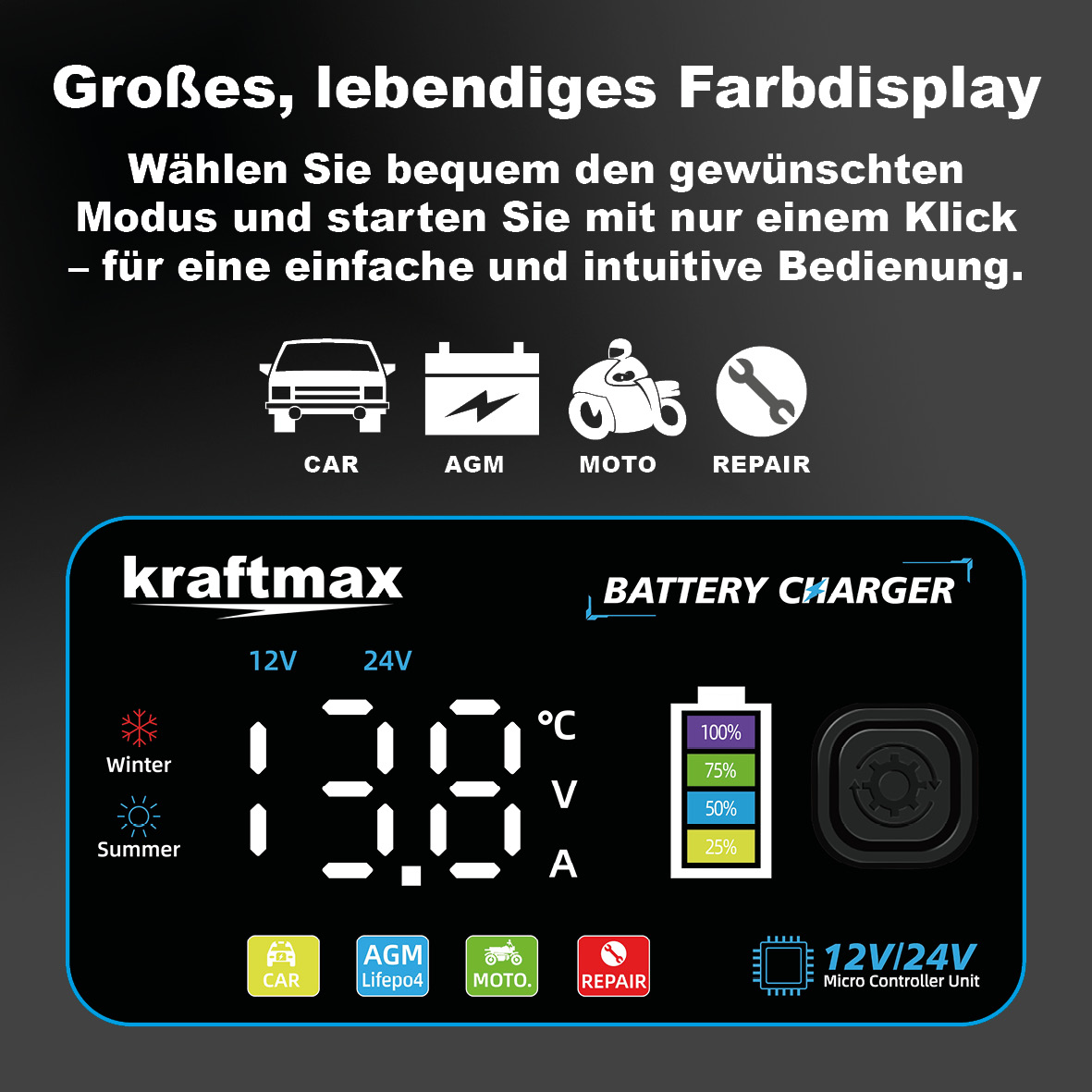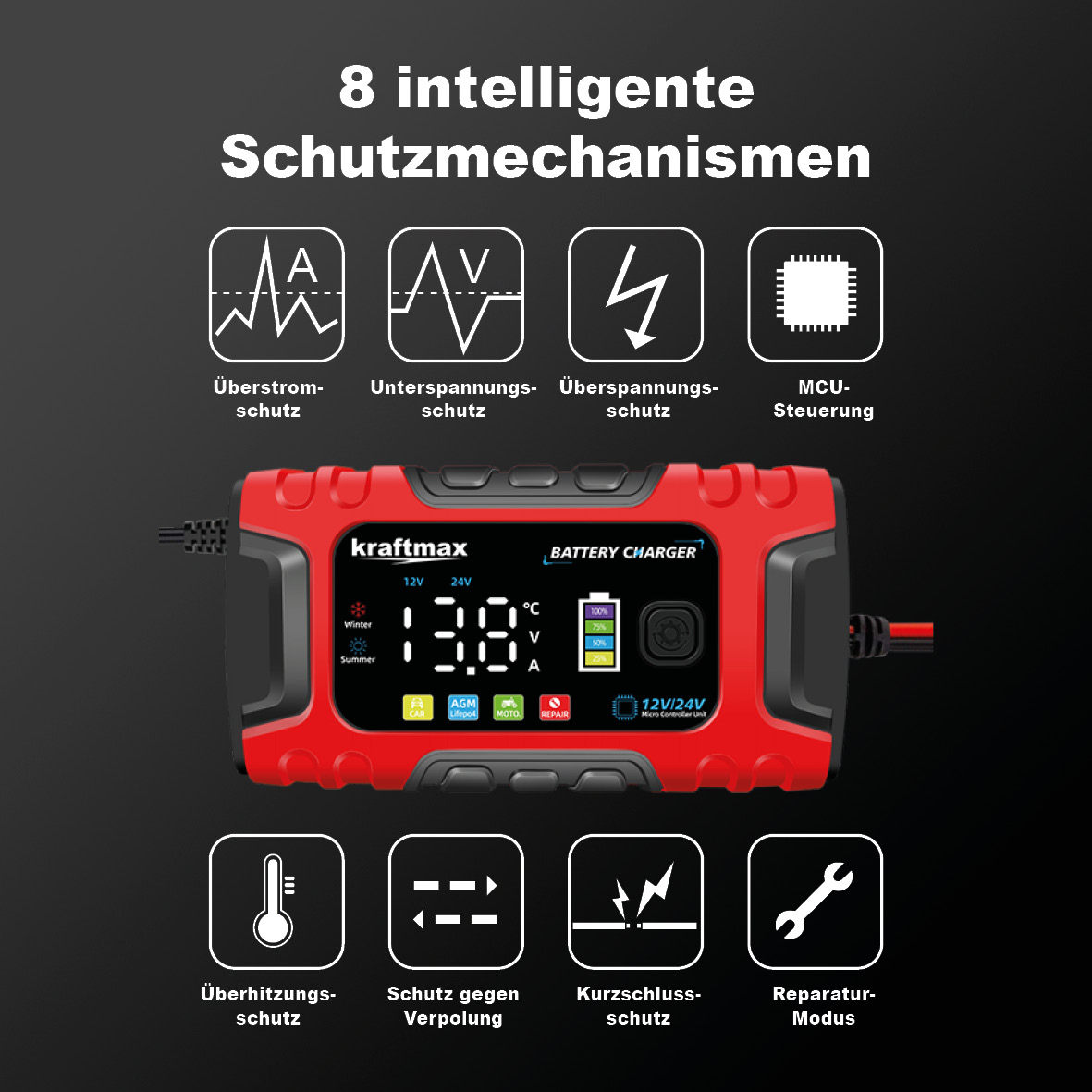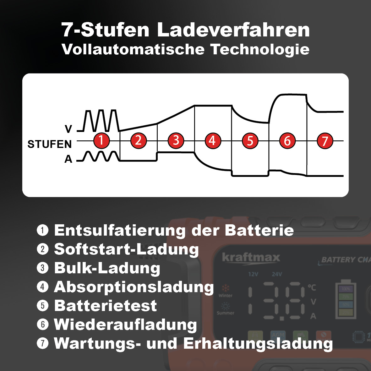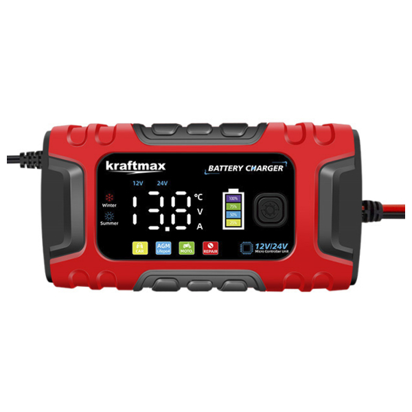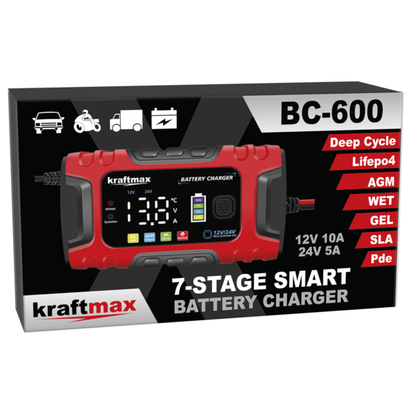7-Stufiges vollautomatisches Smart-Ladegerät mit LCD-Display, für AGM, Nass, Gel, Blei-Säure und LiFePO4 Batterien/Akkus . Das Kraftmax Batterieladegerät ist ein multifunktionales Ladegerät, das speziell für 12V- und 24V Blei-Säure-Batterien sowie Lifepo4-Batterien entwickelt wurde.