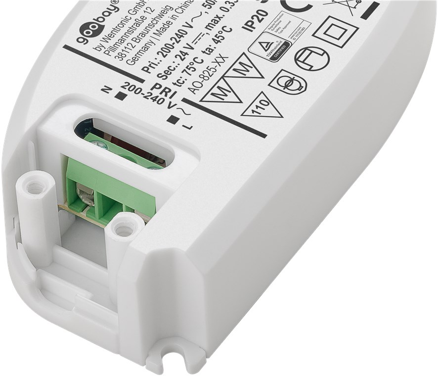24V LED Trafo. Einsatz z.B. für 24V LED Strips, 24V LED Ein- bzw. Aufbauleuchte, LED Wand- bzw. Bodeneinbaustrahlern usw. Hochwertiges LED EVG Vorschaltgeät  Einfache Montage über interne Schraubklemmen eingebettet im robusten Kunststoffgehäuse Stromversorgungseingang Eingang 230V 50Hz Typisch 28VA Autom.Weitbereichseingang - dadurch weltweit einsetzbar 100...240Vac Ausgangsspannung = 24V Gleichspannung Ausgang Belastbarkeit: 0-20 Watt = max. 0,833A Keine Mindestlast erforderlich somit 0-20 Watt alles anschließbar MM-Zeichen und SELV Vorschaltgerät mit elektronischem Kurzschluss-, Überlast- und Thermoschutz Keur, ta 50°C, tc 80°C Abmessungen: L:146mm B: 55mm H:19mm Superflach nur 19mm hoch !