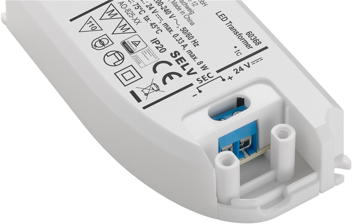 24V LED Trafo 230V bis 8Watt LED Konverter SELV MM-Zeichen flache Bauform nur 19mm Höhe