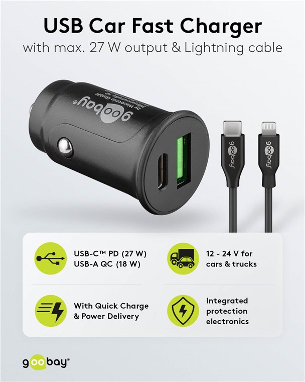 - Kfz-Ladeadapter mit 1x USB-C und 1x USB-A Buchse inkl. 1m USB-C-Kabel,