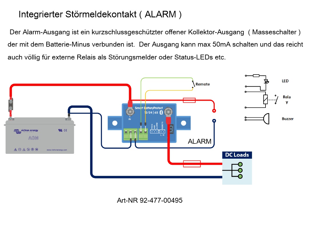 Dieser 12V bzw. 24V Batteriewächter bzw. Akkusaver ( BatteryProtector ) schützt Ihren Bleiakku, USV-Akku, Notstromakku, AGM-Akku, Solarakku oder auch Autobatterie vor Tiefentladung durch das rechtzeitige Abschalten von allen DC-Verbrauchern ein Alarmausgang dient als Störmeldekontakt zur freien Verwendung Batteriewächter Tiefentladeschutz für 12V olt 24V Akkusysteme egal ob Bleiakkus oder Lithiumakku Integrierter REMOTE-Eingang ( Ferneinschaltung / Batterieschalter ) = Integrierte Klemme(n) zum ferngesteuerten Ein-/Aus Schalten der Last ( wie ein SolidState Relais jedoch per Mosfet-Halbleiter ). *** Kann als System-Ein-Aus-Schalter verwendet werden ***Wenn der Remotekontakt ausgeschaltet ist, wird der REMOTE-Eingang potenzialfrei. Die Lastausgang wird sofort abgeschaltet. Wenn der Schalter wieder eingeschaltet wird, wird der Eingang REMOTE auf „High“ geschalten und die Lastausgang wird sofort eingeschaltet. *** SIEHE AUCH WEITERE BILDER HIERZU !!! ****Der BatteryProtect trennt die Batterie ( Akku Bleiakku ) vom Verbraucher (Last ), bevor sie vollständig entladen ist (wodurch sie beschädigt würde) bzw. bevor sie nicht mehr über ausreichend Energie zur verfügung hätte. 12V oder 24V Systemspannung : automatische Erkennung des Spannungsbereichs Der BatteryProtect erkennt die Systemspannung automatisch. Einfach Programmierung / Einstellung über LED-Display : Der BatteryProtect lässt sich so einstellen, dass sie sich bei mehreren verschiedenen Spannungen ein- bzw. ausschaltet. Die Siebensegmentanzeige gibt dann an, welche Einstellung / Programmierung gewählt wurde. Eine besondere Einstellung für Lithium-Ionen-Batterien In diesem Modus lässt sich der BatteryProtect durch das VE.Bus BMS steuern. Hinweis: Die BatteryProtect kann auch als Ladungsbrechers zwischen einem Batterieladegerät und einem Li-Ionen-Akku verwendet werden. Siehe Anschlussplan im Handbuch. Extrem niedriger Stromverbrauch : Das ist wichtig im Falle von Lithium-Ionen-Batterien, insbesondere nach dem Abschalten aufgrund eines niedrigen Spannungslevels. Bitte beachten Sie hierzu auch unser Datenblatt über Lithium-Ionen-Batterien und das Handbuch des VE.Bus BMS für weitere Informationen. Überspannungsschutz : Damit empfindliche Verbraucher nicht durch eine Überspannung beschädigt werden, wird die Last immer dann abgeschaltet, wenn die Gleichspannung den Wert von 16V bzw. 32V überschreitet. Explosionsschutz : Keine Relais sondern MOSFET-Schalter und daher keine Funkenbildung. Störungsmelder ( Ausgang für verzögerten Alarm ) : Der Alarm-Ausgang ( siehe auch Bild-4 ) wird üblicherweise dazu verwendet, um ein akustisches Signal also ein Signalgeber, Buzzer, Alarmlicht, LED usw. oder besser ein Relais zu aktivieren um eine klassische Störungsmeldung ab zu setzten. Welches Relaisart Sie dazu verwenden obliegt ihnen ... Monostabil... Bistabil... Zeitrelais mit Rücksetzfunktion da ist alles möglich. Dieser Alarm-Ausgang wird dann aktiviert, wenn die Batteriespannung mehr als 12 Sekunden lang unter den voreingestelten Wert zum abschalten fällt. Das Einschalten der Last aktiviert daher den Alarm nicht. Der Alarm-Ausgang ist ein kurzschlussgeschützter offener Kollektor-Ausgang ( Masseschalter ) der mit dem Batterie-Minus verbunden ist. Der Ausgang kann max 50mA schalten und das reicht auch völlig für externe Relais als Störungsmelder oder Status-LEDs ( siehe Bild-4 ) Lastabschaltungs- und Wiederanschlussverzögerung : Die Last wird 90 Sekunden nach Aktivierung des Alarms abgeschaltet. Steigt die Batteriespannung innerhalb dieses Zeitraums (nachdem zum Beispiel der Motor gestartet wurde) erneut bis auf den Schwellwert zum Anschließen an, wird die Last nicht abgeschaltet. Die Last wird 30 Sekunden nachdem die Batteriespannung den vorgegebenen Spannungswert zum Wiederanschließen überschritten hat, wieder angeschlossen. Technische Daten : + Betriebsbereich Spannung 12V oder 24V typisch ( Range 6-35V DC ) + Standardschwellwerte wie folgt : Bei 12V Akku ab-, bzw. ausschalten: 10,5V Bei 24V Akku ab-, bzw. ausschalten 21V Bei 12V Akku einschalten bei 12V Bei 24V Akku einschalten bei 24V + Belastbarkeit 0-65A Strom max 65A / Max. unterbrechungsfreier Laststrom 65A / Spitzenstrom kurzfristig 250A + Stromverbrauch der Schaltung : wenn an = 1,5mA + Wenn aus oder nach Abschalten bei niedriger Spannung : 0,6mA + Wiederanschlussverzögerung = 30 Sekunden Verzögerung Alarmausgang = 12-Sekunden Verzögerung Last abschalten = 90 Sekunden (sofort, wenn durch das VE.Bus BMS ausgelöst) + Maximale Last am Alarmausgang für opt. Standardrelais oder Birnchen = 50mA (kurzschlussfest) + Schutzgrad: Elektronik: IP67 (vergossen) Anschlüsse: IP00 + Anschluss: 2x M6 ( Befestigungsdrehmoment 5Nm ) + Belastbarkeit Arbeitskontakt = Strom max 65A + Abmessungen : (L x B x H): 106 x 48 x 40mm + Gewicht : 0,25KgZusatzinfo dieses Produkt ist wie folgt erhältlich : Art-Nr 92-477-00490 = Modul System-Ein-Aus-Schalter mit Batteriewächter 12/24V bis 65A ( Standard-Version ) Art-Nr 92-477-00495 = Modul System-Ein-Aus-Schalter mit Batteriewächter 12/24V bis 65A ( Bluetooth-Version mit APP ) Zubehör hierzu ist wie folgt erhältlich ( siehe auch im Zubehör-Register ) : Art-Nr 42-772-00675 = 16qmm Kabellitze ROT Art-Nr 45-821-01100 = 16qmm Ringkabelschuh M6 Art-Nr 31-888-03670 = 70A Sicherungsautomat Art-Nr 39-400-00095 = AGU Sicherungshalter bis 80A ....... usw. Art-Nr 31-842-00450 = 50A AGU Fuse Art-Nr 31-842-00460 = 60A AGU Fuse Art-Nr 31-842-00480 = 80A AGU Fuse Für Fragen hierzu stehen wir ihnen gerne zur Verfügung .. ggf. einfach kurz anrufen unter 07362-919093 Weitere Zusatzinfo ... dieses Modul ist auch als 100A und 220A Version erhältlich !
