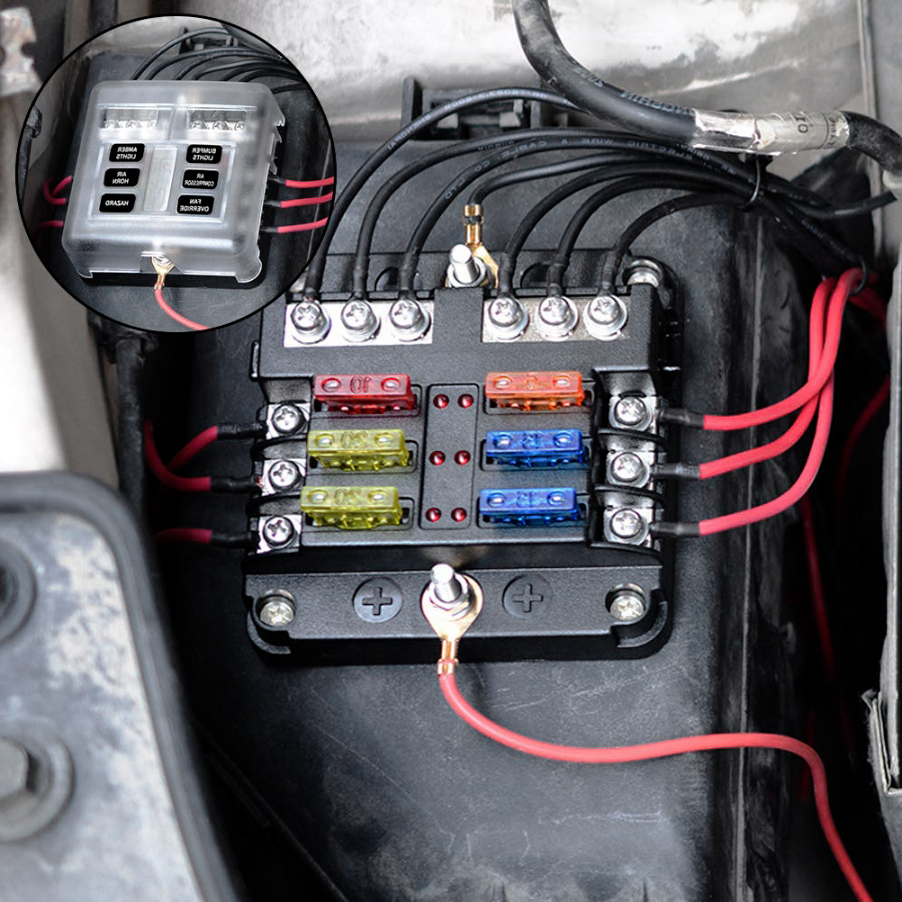 Sicherungshalter 6-fach für KFZ ATC Sicherungen mit Status-LED Aufkleber und 12 ATC Sicherungen