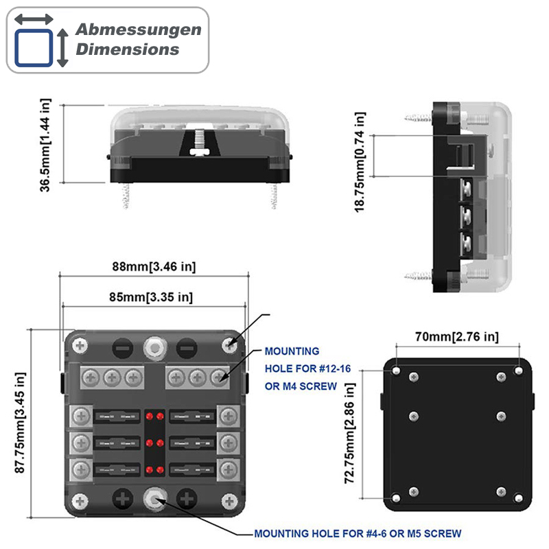 12-fach Sicherungshalter für KFZ Flachstecksicherungen = ATC Sicherungen ( ATC Fuse ) 12-fach Sicherungshalter für KFZ Flachsteck Sicherungen (ATC / ATO Fuse) Dieses modulare System ermöglicht es ihnen individuelle Stromverteiler und Sicherungshalterkombinationen 12-fach Sicherungshalter bzw. Sicherungsverteiler für KFZ Flachsteck Sicherungen ( übliche ATC / ATO Fuse )Dieses tolle Sicherungsystem ermöglicht es ihnen individuelle Stromverteiler und Sicherungshalterkombination für jedes Fahrzeug, Caravan, Wohnmobil, LKW, Traktor, Boot, Gartenhaus aufzubauen. Einsatzbereich typisch 12V oder 24V Sicherungshalter für KFZ Sicherungen ( übliche ATC Fuse ) Kabelanschluss beidseitig Schraubkontakt für Ringschuhe oder U-Schuhe + und - Batterieanschluß über M5 Schraubkontakt 3mm Status LED für Sicherung max. 100A Gesamtbelastbarkeit Spannung typisch 6V 12V 24V max. 32Volt DC Betriebsspannung max. 30 Amp pro Sicherung Abmessungen siehe auch Zeichnung weitere Bilder Abmessungen gesamt : B: 85mm L: 123mm H: 38mm Befestigungsbohrungen : 123x70mm Temperatur-Einsatzbereich -40 bis +105 Grad Celsius Die Lieferung erfolgt mit auf den Fotos abgebildeten ATC Sicherungen LIEFERUMFANG 1x Sicherungshalter 12-fach mit Klarsichtabdeckung 12x ATC Sicherungen 3x20A, 3x15A, 3x10A, 3x5A4x Schrauben 1x Aufkleberbogen für die Beschriftung