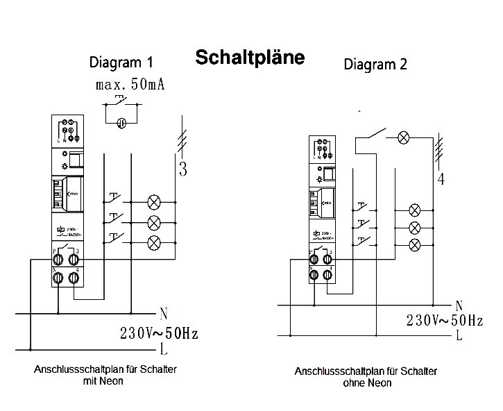 mit elektromechanischer Verzögerung 1-7 Minuten, Dauer-Einschalter,