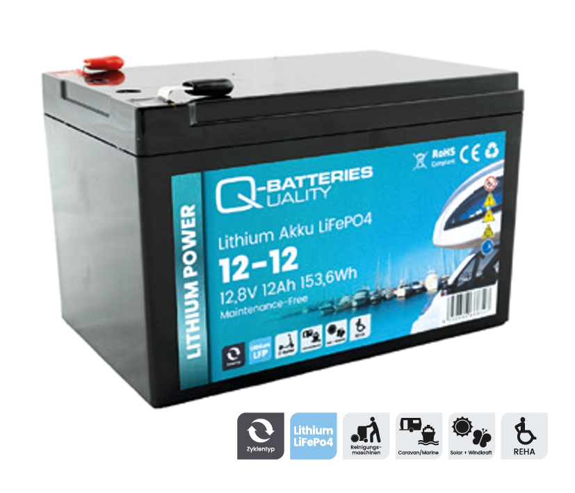 Die Q-Batteries Lithium Batterie 12Ah mit Lithium-Eisen-Phosphat-Technologie (LiFePO4) ist eine zyklenfeste und vielseitig einsetzbare Batterie. Im Vergleich zu Blei Batterien sind Lithium-Ionen Akkus deutlich leichter und haben einen längere Lebensdauer. Auch unter extremen Bedingungen oder Fehlanwendung besteht keine Explosionsgefahr, da die innovative Zelltechnologie eine hohe Betriebssicherheit, lange Lagerfähigkeit und große Temperaturbereiche bietet.