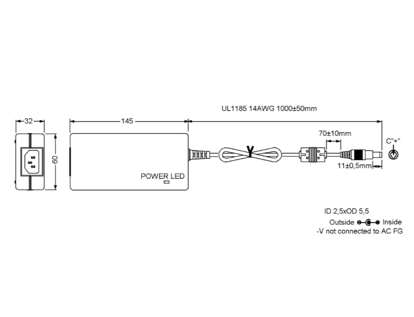 - Hohlstecker 5,5x2,5mm Polarität + innen