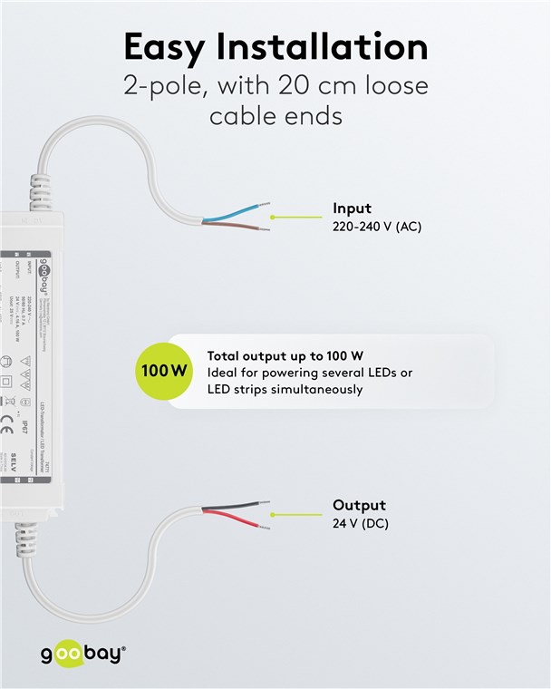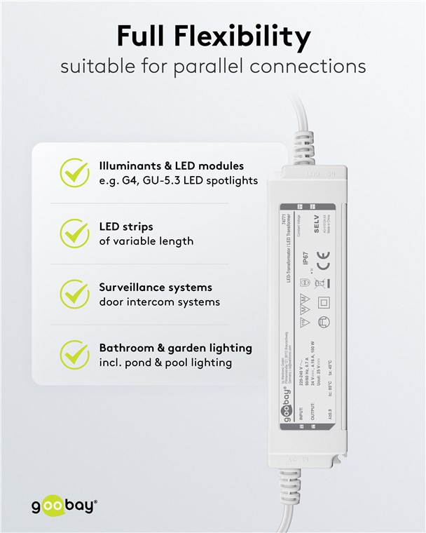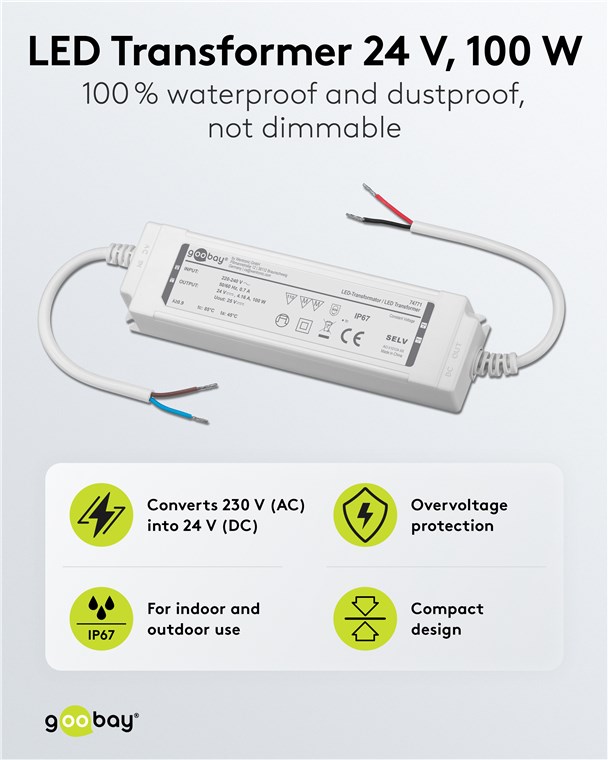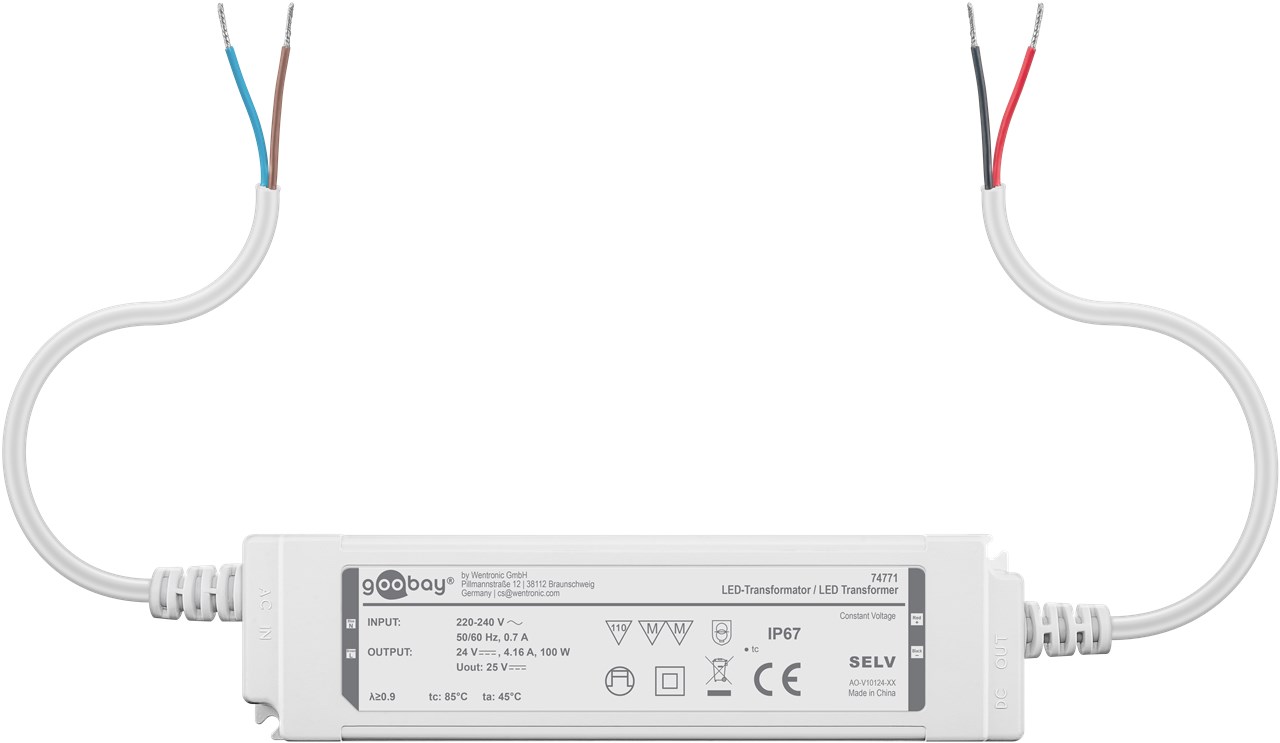 Netzteil für für LED- und Beleuchtungsanwendungen IP67, für Innen- und Außenanwendungen z.B. im Feuchtebereich (z.B. Industrie- Gastro- oder Ausseneinsatz) nach IP67 mit konstante Ausgangsspannung von 24V Gleichspannung Ideal für Licht-Setups in Feuchträumen und im Outdoorbereich, z. B. Bad- und Gartenbeleuchtung sowie Teich- oder Poolbeleuchtung. Der Trafo versorgt LEDs mit konstanter Spannung (CV) und bietet so eine hohe Flexibilität, z. B. beim Anschluss unterschiedlicher Längen von LED-Streifen. Die perfekte Lösung für LED-Module mit fester Spannung und eigenem Vorwiderstand.