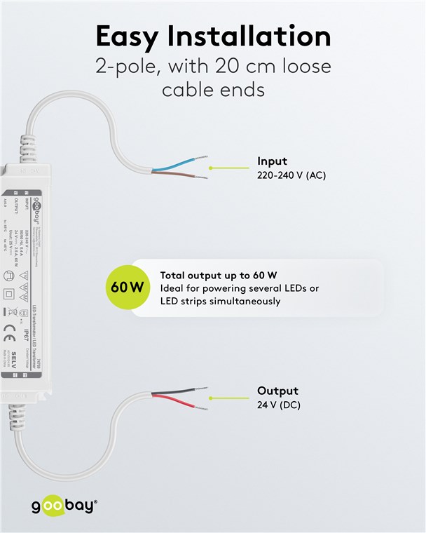 Produktinformationen "24V LED Netzteil 24V 60W 2,5A IP67 Indoor Oudoor SELV MM-Zeichen"