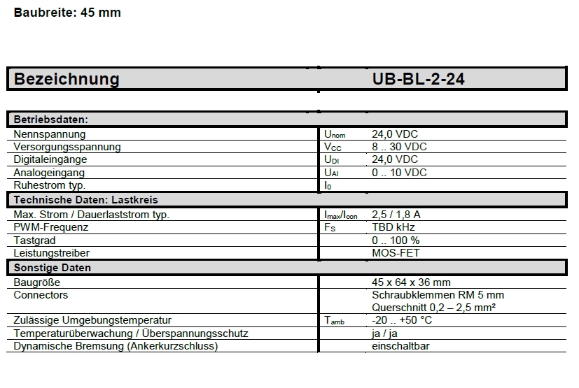 + Das Modul UB-BL-2-24 ist eine Motorsteuerung für BLDC- oder DC-Motoren, zur Verwendung im industriellen Umfeld ideal ausgelegt