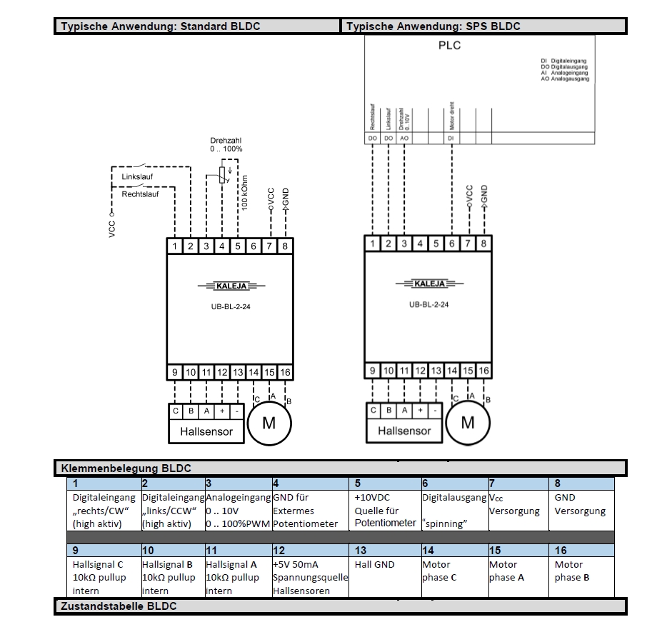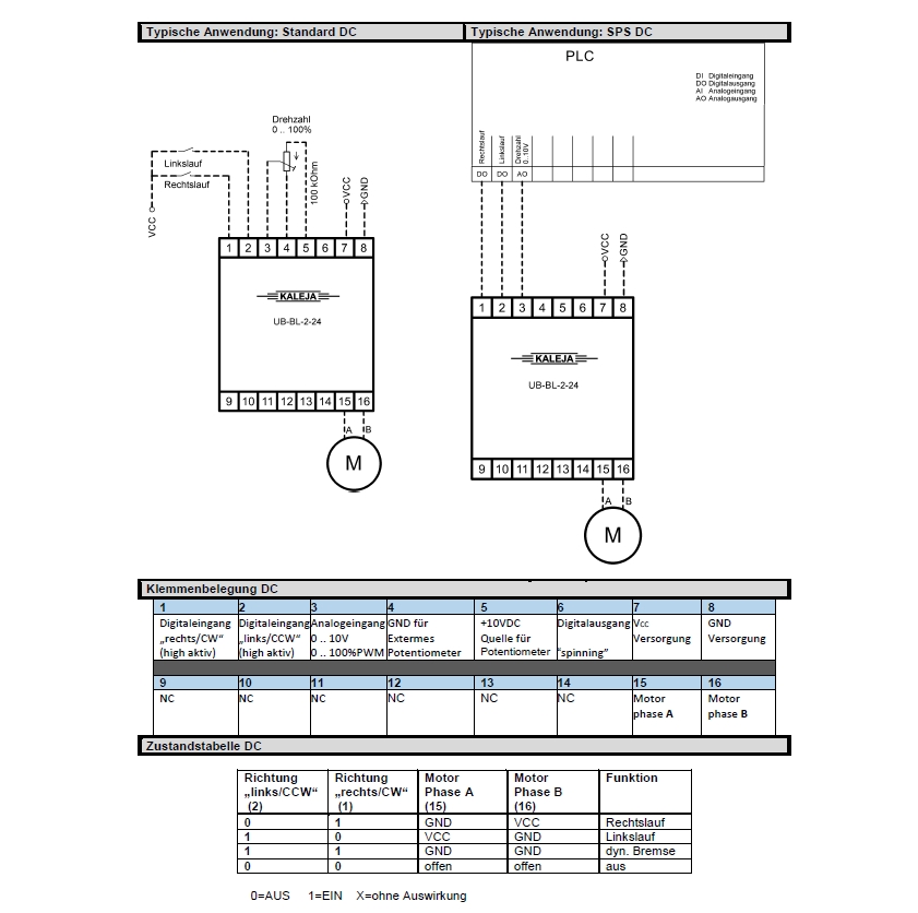 Das Modul UB-BL-2-24 kann auch mit DC-Motoren betreiben werden. Die Funktionalität unterscheidet sich nur beim Digitalausgang. Da keine Hallsensoren Ausgewertet werden ist der Ausgang ohne Funktion