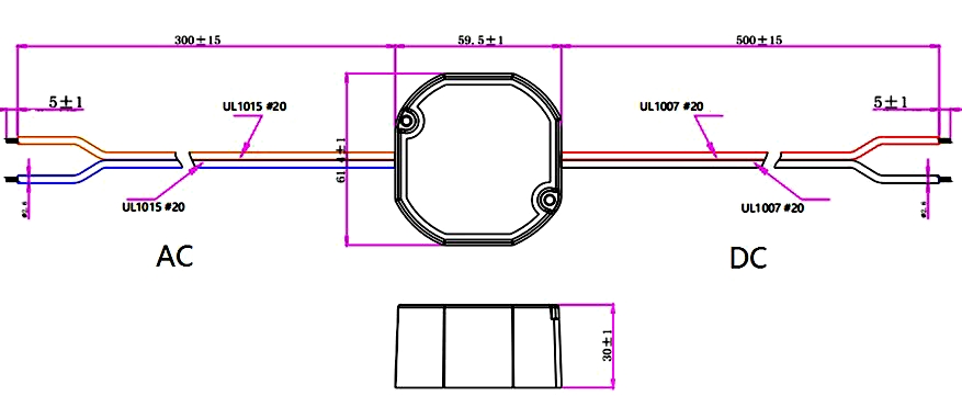 - Kabelanschluß über ca. Litzenkabel ( 300mm Input / 500mm Output )