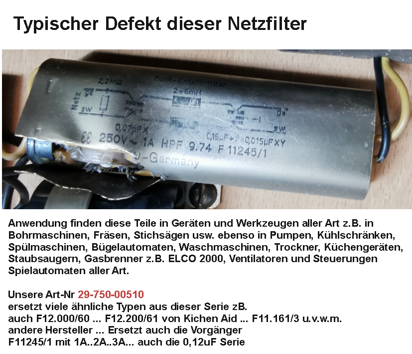 Anwendung finden dieser LC-Kondensatoren in Geräten und Werkzeugen aller Art z.B. in Bohrmaschinen, Fräsen, Stichsägen usw. ebenso in Pumpen, Kühlschränken, Spülmaschinen, Bügelautomaten, Waschmaschinen, Trockner, Küchengeräten, Staubsaugern, Gasbrenner z.B. ELCO 2000, Ventilatoren und Steuerungen aller Art. Ersetz viele ähnliche Typen dieser Serie zB. auch F12.000/60 ... F12.200/61 von Kitchen Aid ... F11.037/163... F11.161/3 u.v.w.m. andere Hersteller ... Universell verwendbar ersetzt auch die Vorgänger F11.245/1 mit 1A..2A..3A... auch die 0,12uF Serie