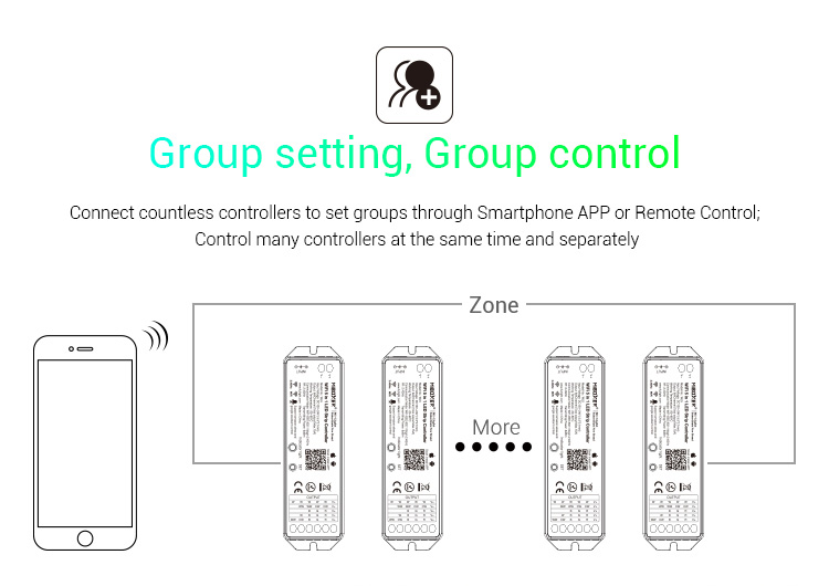Eine weitere Besonderheit ist die Synchronisierbarkeit von mehrer dieser Kontroller wenn Sie entweder mehr Leistung benötigen oder mehrer unterschiedliche LED Zonen haben möchten. Die Synchronisierbarkeit erfolgt ohne Kabel sondern über 2,4Ghz Funktechnik die bereits integriert ist. Über 16Mio Farben kann er steuern, Lichteffekte und Farbwechsel ganz einfach über integriertem 2,4Ghz Funktechnik per APP oder zukaufbaren Funk-Fernbedienung oder Aufputz Funktastern.