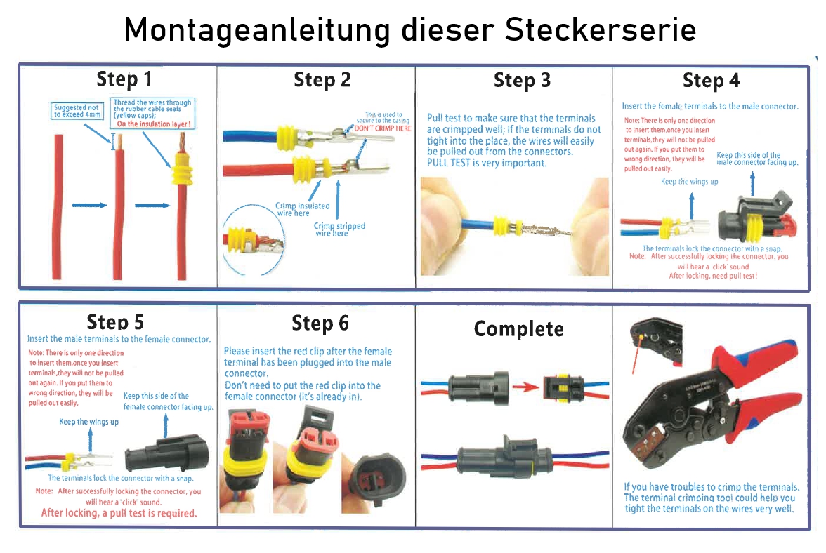 3pol Stecker mit 3pol Kupplung IP67 wasserdichter KFZ-Steckverbinder ( Automotive ) Typische Anwendung KFZ, LKW, Traktor, Oldtimer, Motorrad, Roller, Mofa, Boot, Truck, Bus, Caravan, Bagger usw. SUPERSEAL Steckverbinder als Set = Stecker und Kupplung. Wasserdichter Steckverbinder IP-67 Steckverbinder typisch für 12V ... 24V bis 10A Belastbar ( max 48V ) Inhalt: SUPERSEAL Stecker- und Buchsengehäuse inklusive Flachsteckhülsen, Flachsteckern und Gummiabdichtungen. Widerstandsfähig gegen: Wasser, Salze, Benzin, Diesel, Bremsflüssigkeit und Motoröl... Typischer Einsatz: KFZ, LKW, Motorrad, Oldtimer, Traktor, Anhänger, Landwirtschaftliche Geräte, Boote usw.Technische Details: Polzahl: 3 Schutzgrad IP67 Temperatureinsatzbereich -40°C bis +125°C Verpolungs- und kontaktsicher Anschlußquerschnitt: 0,75-1,5qmm Beschriftung auf Verbindern Ja = 1 - 2 - 3 Belastbarkeit: bis 10A je Kontakt max Peak 14A Typ. Einsatz im Spannungsbereich: 6V 9V 12V 24V 36V max 48V Material: Zinnbronze Oberfläche verzinnt Kontaktwiderstand: max. 3,0 mOhm Quetsch-, bzw. Crimp-Kontakte mit Einzeldraht Dichtungen: Silikon Rubber Material Kontaktraster: 6,0 Kabeleinlass: gelb für Aussendurchmesser 1,7-2,4mm ( z.B. 0,75.....1,0...1,5qmm ) Einzeladerdichtung grün für Aussendurchmesser 1,2-1,6mm ( z.B. ( 0,50....0,75.....1,0qmm ) Abmessungen Montage usw. siehe auch weitere Bilder ! Erhältlich ist dieser Steckersatz als 1-pol, 2-pol, 3-pol, 4-pol, 5-pol und 6-polige Ausführung = siehe im Register unten unter Ähnliche Artikel !