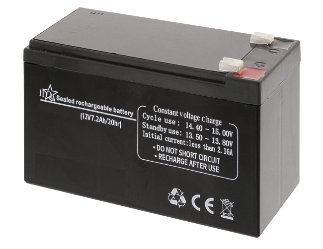 12V Bleiakku 7,2Ah 151x65x94mm mit 6,3mm Kontakten versiegelt, vollständig wiederaufladbar, wartungsfrei.Zur Verwendung als sekundäre 12V Stromquelle 12V Bleiakku wartungsfrei und verschlossen durch Ventilregulierung. Niedrige Selbstentladung, lange Gebrauchsdauer, einfache Ladung, kein Gefahrengut. Mit 2x 6,3mm Flachstecker Anschlüssen. Beide Kontakte auf der schmalen Seite Abstand der Kontakte. ca.: Mitte-Mitte 44mm. Initial Current 2,16A Stand by use: 13,5..13,8V Cyclice Use: 14,4..15,0V Abmessungen: L:151mm B:65mm H:94mm Gewicht 2,7Kg