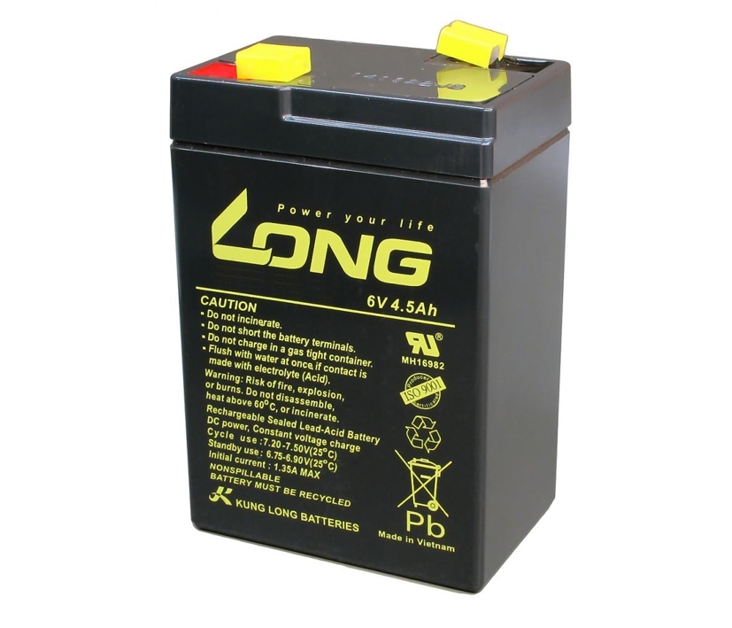 6V 4.5Ah Bleiakku Long Blei-Gel-Akkumulatoren (wartungsfrei) Wiederaufladbare Akku Diese Akku ersetzt auch Akku 3FM3.5 Power-Sonic PS640F, Werker WKA6-5F, Fifutec JL3-XM, Genesis NP6V 4AH , Yuasa NP4-6, GEL CELL 6V4,5Ah, Panasonic LC-R064R5P, Fiamm FG10451, und viele weitere mehr mit ähnlicher Kapazität + Einsatz typisch Kinderfahrzeuge usw. 6Volt Akku mit Abm 70x47x102mm + Blei-Gel-Akkumulatoren (wartungsfrei) Spannung: 6 Volt Kapazität 4,5Ah 20HR ( ersetzt somit auch alle seine Vorgänger mit 2,7Ah 2,9Ah 3Ah 3,3Ah 3,5Ah 3,7Ah 4Ah 4,2Ah ) Tiefentladesicher, auslaufsicher Lageunabhängig zu betreiben Abmessungen: (LxBxH): 70 x 47 x H: 98mm Korpus / H 102mm mit Kontakten Anschlüsse über 2 Steckkontakte (4,8mm Flachstecker) Kapazität: 4,2Ah (20hour Rate) Innenwiderstand: 20mOhm Lademöglichkeiten: 1Std mit 2,7A 5Std. mit 0,68A oder 10Std. mit 0,37A 20Stdt. mit 0,2A Selbstentladungszyklus bei 25°C: 3Monate = 91% 6 Monate = 82% 12 Monate=64% zyklische Anwendung: Konstantladespannung bei 7,2...7,5V Cycle Use: 7,25...7,45V Standby-Anwendung: Ladespannung 6,75...6,9V Standby USE 6,8...6,9V Initial Current: less than 1,68AGewicht: 900g Dieser Akku ersetzt auch viele andere Hersteller mit selben Abmessungen wie Panasonic LC-R064R5P, Einsetzbar als Ersatz für: Power-Sonic PS640F, Werker WKA6-5F, Fifutec JL3-XM, Genesis NP6V 4AH , Yuasa NP4-6, GEL CELL 6V4,5Ah, Panasonic LC-R064R5P, Fiamm FG10451, usw Dieser wartungsfreie Bleiakku kann in Notstromversorgungen, Alarmanlagen, Solaranlagen, Notbeleuchtungen, im Modellbau usw. eingesetzt werden. Passendes Ladegerät z.B. ( siehe Zubehör-Register) Art-Nr 33-455-00165 = Ladegerät für Akkus 4,8V / 6V / 7,2V / 8,4V / 9,6V ... 0,3A mit div. Hohlsteckern Art-Nr : 33-455-00335 = Ladegerät für Bleiakku 12V+6V+2V bis 0,6A mit 2x Batt.Klemmen Art-Nr : 33-455-00336 = Ladegerät für Bleiakku 12V+6V+2V bis 0,8A mit 2x Batt.Klemmen Art-Nr : 33-455-00420 = Ladegerät für Bleiakku 24V+12V+6V+2V 0,3A bis 0,9A mit 2x Batt.Klemmen