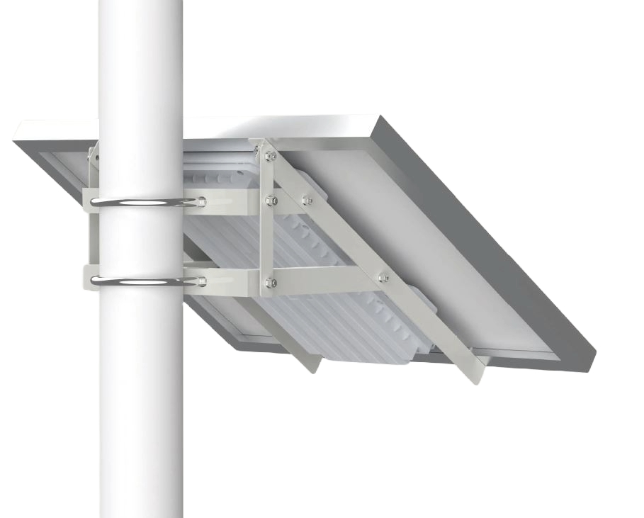 + Das System kommt mit einem U-förmigem Montagebügel anwendbar auf Masten mit einem Durchmesser von 80-114mm der auch für die Säulenmontage verwendet werden kann.