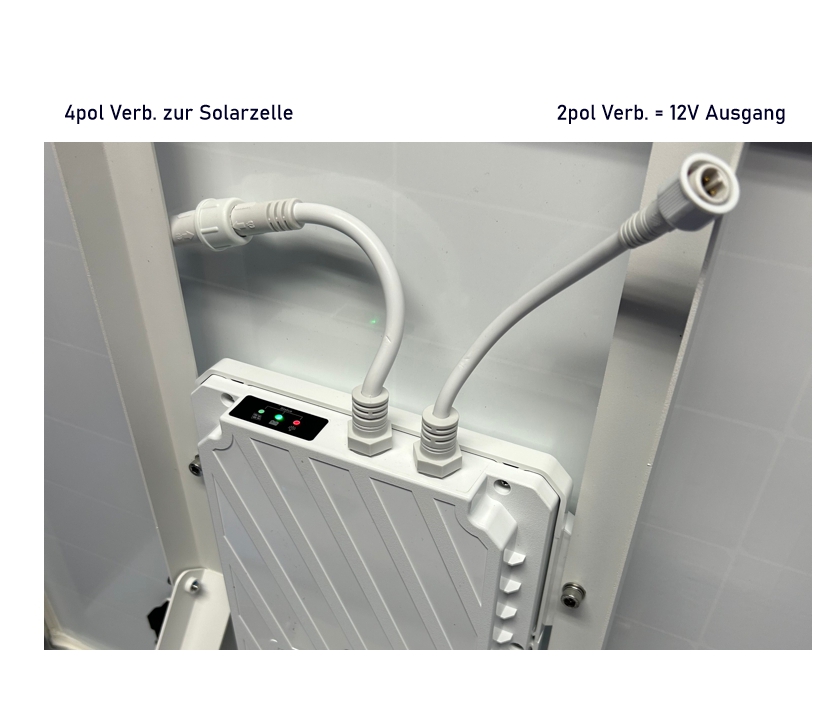 + Die Leitungen auf der Rückseite sind mit 2 Steckern verbunden. 1x Verbinder zur Solarzelle und 1x 12VDC Ausgang für den Verbraucher. Eine wasserdicht Steckerausführung nach IP65 Norm mit Gummidichtung sorgt für eine solide und langlebige Verbindung.
