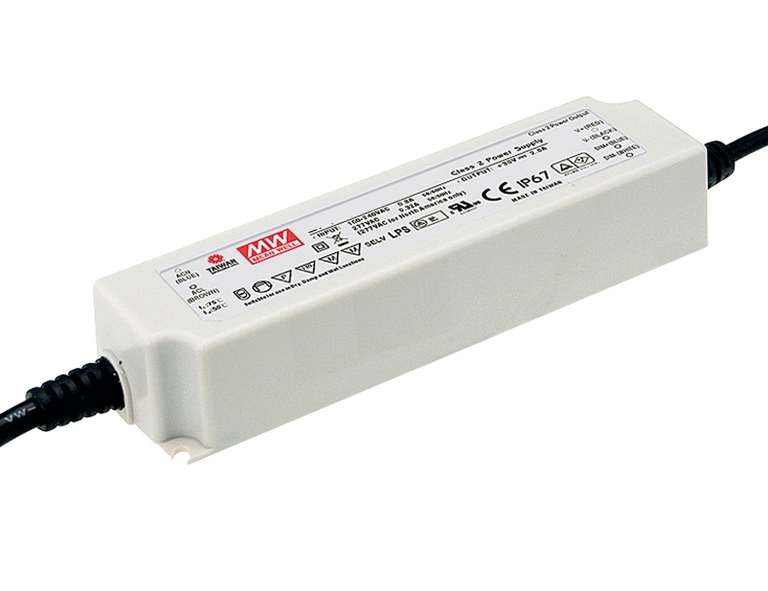 24V 150W Netzteil für universelle Verwendung für Lasten bis 150Watt 24V Netzteil nach IP67 Norm mit Ausgangsspannung von 24V stabilisierter Gleichspannung. Geeignet als 24V Stromversorgung für industrielle Anwendungen, Schaltschrankbau oder als LED-Converter, Beleuchtungstechnik, Messebau usw. Belastbarkeit: 150 Watt an 24 Volt max 6,3A. Kurzschlussabschaltung mit automatischem Wiederstart (Restart). Übertemperaturschutz mit Leistungsreduktion. Anschluß über Litzenkabel Technische Daten: Eingang: typisch 230VAC Eingangsspannungsbereich 180...305Vac 47-63Hz oder auch 254-431V DC Sekundärspannung 24Vdc stabilisierte Gleichspannung Ausgangsleistung: max. 150Watt ( Range 0-150W ) Belastbarkeit Strom Ausgang : 0...6300mA = 6,3A an 24V DC Keine Mindestlast / Ausgang ohne Teillstbereich Ausgang kann auch über NV-Dimmer genutzt werden Ausgangsspannung Tolranz: +/- 5% RippleNoise: 200mV Wirkungsgrad > 89% Überspannungschutz: 27...35V Solides Slime Line Kunststoffgehäuse innen komplett vergossen da IP67 Norm Anschluss Litzenkabel jeweils 300mm Anschlusskabel Eingang ( Primär ) : ca. 30cm Kabel 2 x 0,75qmm ( litze flexibel ) Ausgng ( Sekundär ) : ca. 30cm Kabel 2 x 0,5qmm2 (flexibel) Ausgang 24V DC über Rot=(+) / Schwarz = (-) minus 100% Full loard burn-in getestet Überlastfest: kurzfristig 110-125% Rated Uutput Power Vibrationsfest Ja bis 2G ( 10-500Hz 10min ) Schutzgrad: IP67 Outdoor / Indoor verwendbar Temperatur-Einsatzbereich: -25°C....+65 °C Erfüllt Normen: Klasse II / Class II Unit ohne PE ( FG ) Sicherheits-Standards: UL8750,CSA C22.2 No 250.13-12 UL879,CSA C22.2 No.207-M89,BIS IS15885(for LPV-150-12,24 only), , EAC TP TC 004, IP67 approved. Design refer to EN60950-1 EMC-Emmission: EN55032 (CISPR32) Class B, EN61000-3-2 Class A ( 80 load), EN61000-3-3, EAC TP TC 020 EMC = Compliance to EN61000-4-2,3,4,5,6,8,11; EN55024, light industry level, criteria A, EAC TP TC 020 MTBF = 703Khrs min Abmessungen L:190mm B: 63mm H:3,57mm Befestigungslochabstand = 186mm / Bohrung: 4,5mm Gewicht: 0,74Kg