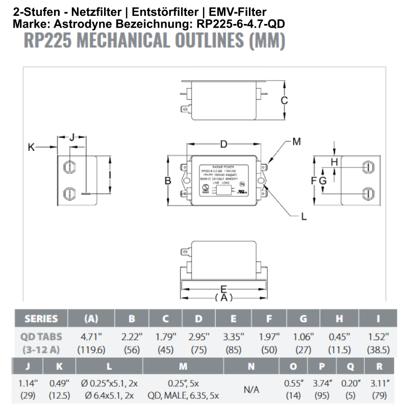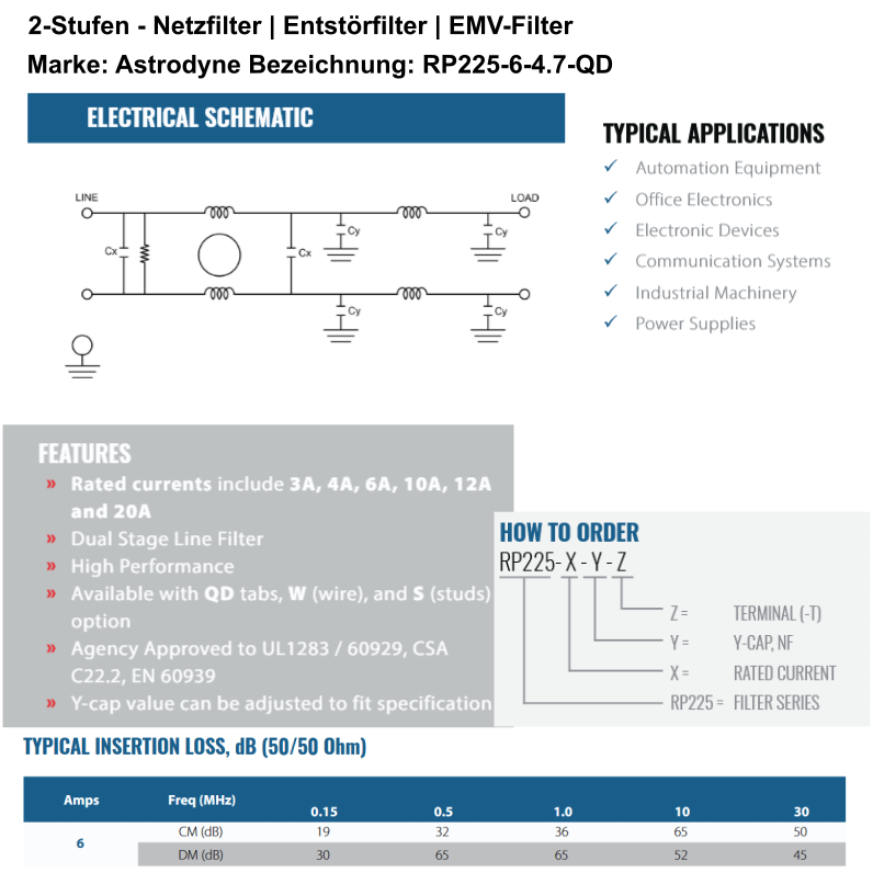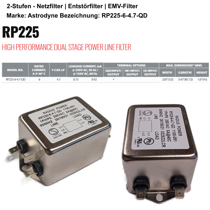 Produktinformationen "Netzfilter 6A 250V StFI Entstör-Filter 2,2mH+4,7nF EMV EMI RFI Filter RP225-6-4.7-QD"