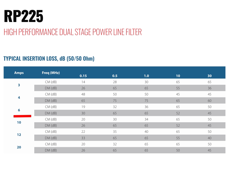 Hohe Dämpfung: Dank des zweistufigen Aufbaus bietet der Filter eine sehr hohe Einfügedämpfung (Insertion Loss) sowohl im Gleichtakt- (CM) als auch im Gegentaktbereich (DM)