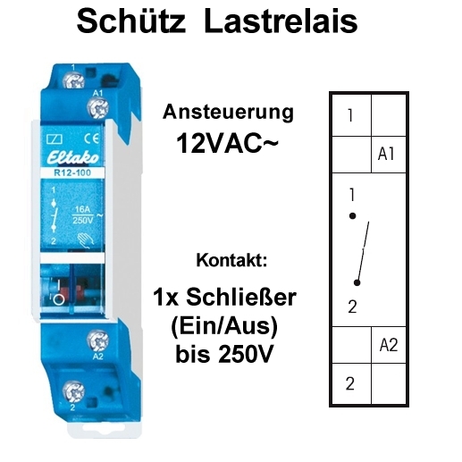 - Funktion: Der Kontakt ( Schließer = NO ) wird geschlossen wenn eine 12VAC = Wechselstromspannung angelegt wird