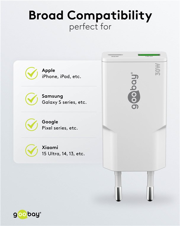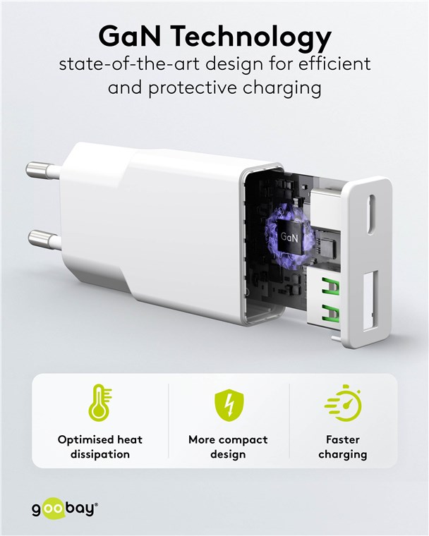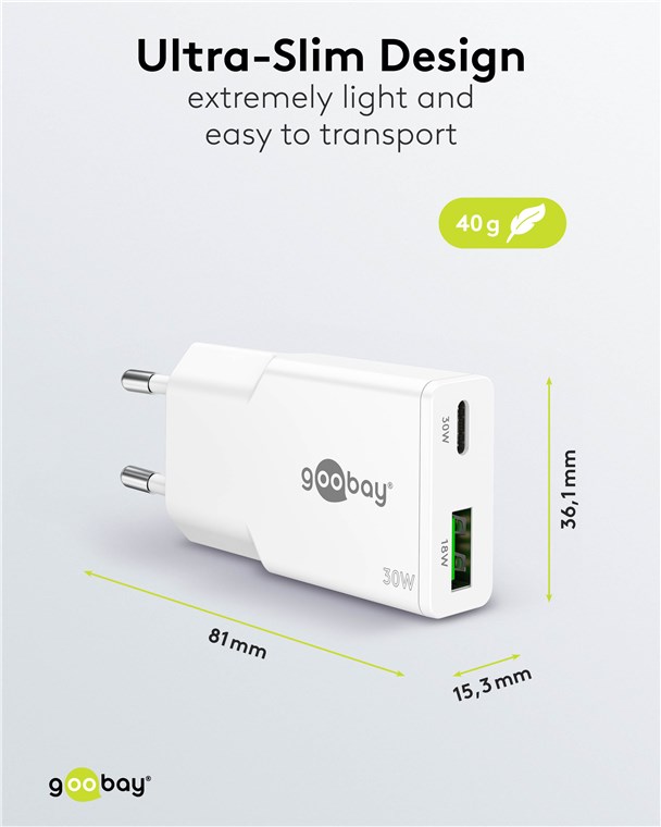 USB-C PD GaN Dual-Schnellladegerät Slim ( 30W) weiß 1x USB-C™-Anschluss (Power Delivery) und 1x USB-A-Anschluss (Quick Charge) . Mit der Slim-Reihe liefert Goobay ein superflaches Charger-Design ab. Speziell zugeschnitten auf die Bedürfnisse von Reisenden, passt das schlanke USB-Netzteil in jede Tasche und jedes Gepäckstück.