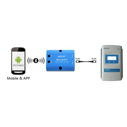 Box eBox-BLE-01 ermöglicht eine drahtlose Überwachung mittels Bluetooth-Kommunikation zwischen den dazu passenden Solarreglern und oder Wechselrichtern der Firma EPsolar / EPEVER und der Smartphone APP. Die Parametereinstellung, das Überwachen etc. ist komfortabel über das Interface der APP möglich.